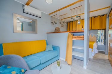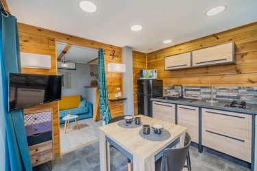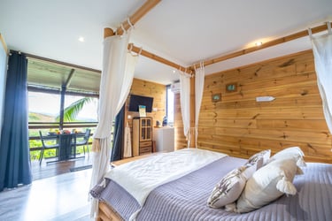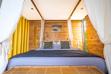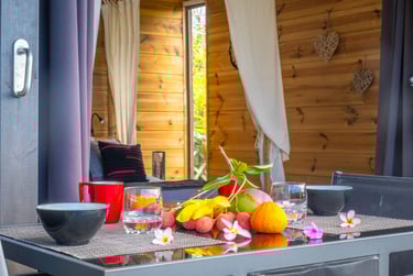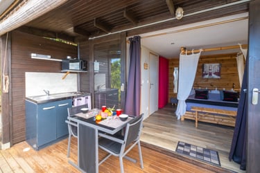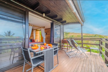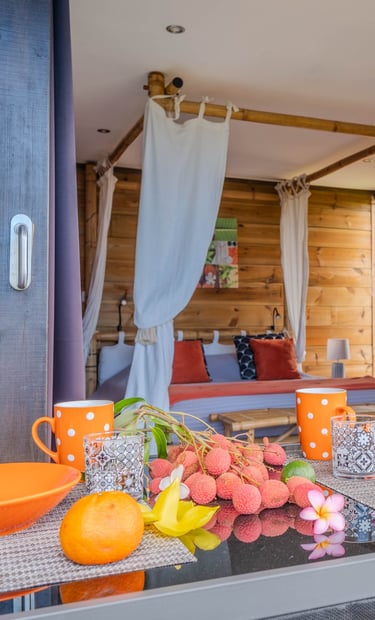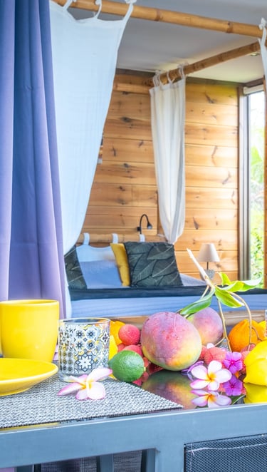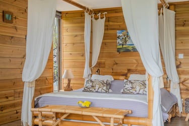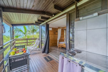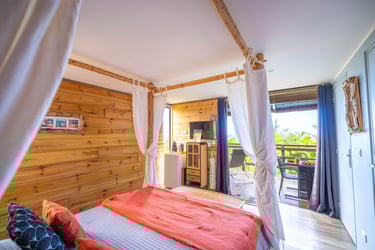 Le bungalow Manguier, aux nuances de vert apaisantes, vous plonge dans une ambiance sereine, parfaitement accordée à la nature environnante. Depuis votre terrasse de 11 m² avec kitchenette équipée, profitez de cet écrin de verdure. À l’intérieur, un espace raffiné et pratique vous attend : lit à baldaquin, douche à l’italienne et rangements ingénieux. Un véritable cocon, parfait pour une parenthèse romantique.