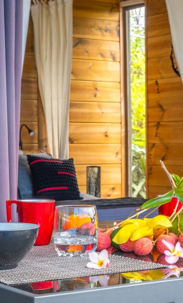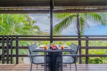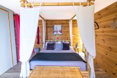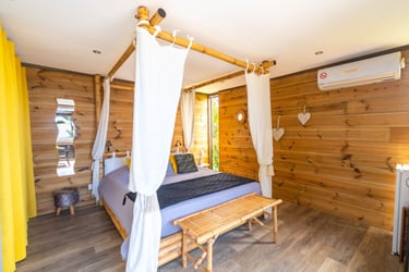 Le bungalow Manguier vous enveloppe dans une atmosphère paisible et intimiste. Depuis votre terrasse de 11 m², sans vis-à-vis mais sans vue dégagée, savourez la tranquillité des lieux. À l’intérieur, un espace élégant et fonctionnel vous accueille avec un lit à baldaquin, une douche à l’italienne, des rangements bien pensés et une petite cuisine équipée pour plus d’autonomie. Un véritable cocon, idéal pour une escapade romantique.